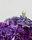 Four diverse floral beauties, united by their gorgeous shades of purple, have gracefully come together in perfect agreement to present you with ‘Celestially Yours’ – a precious gift from nature crafted especially for you. The sense of mystery brought by the delicate hydrangea and the dramatic flair of a globe thistle, as displayed by the echinops, seamlessly intertwines with the clematis’ fragrance and the chrysanthemums’ regality, harmonizing to create a color palette reminiscent of a celestial galaxy, not in the distant space, but one very close to your heart.